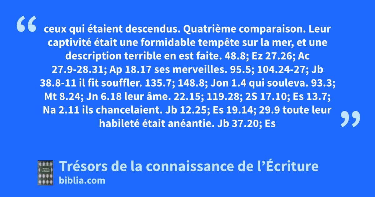 ceux qui étaient descendus. Quatrième comparaison. Leur captivité était une formidable tempête sur la mer, et une description terrible en est faite. 48.8; Ez 27.26; Ac 27.9-28.31; Ap 18.17