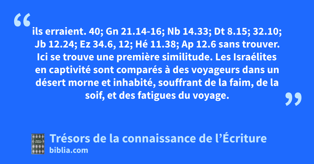 ils erraient. 40; Gn 21.14-16; Nb 14.33; Dt 8.15; 32.10; Jb 12.24; Ez 34.6, 12; Hé 11.38; Ap 12.6 sans trouver. Ici se trouve une première similitude. Les Israélites en captivité sont comparés à des voyageurs dans un désert morne et inhabité, souffrant de la faim, de la soif, et des fatigues du voyage.