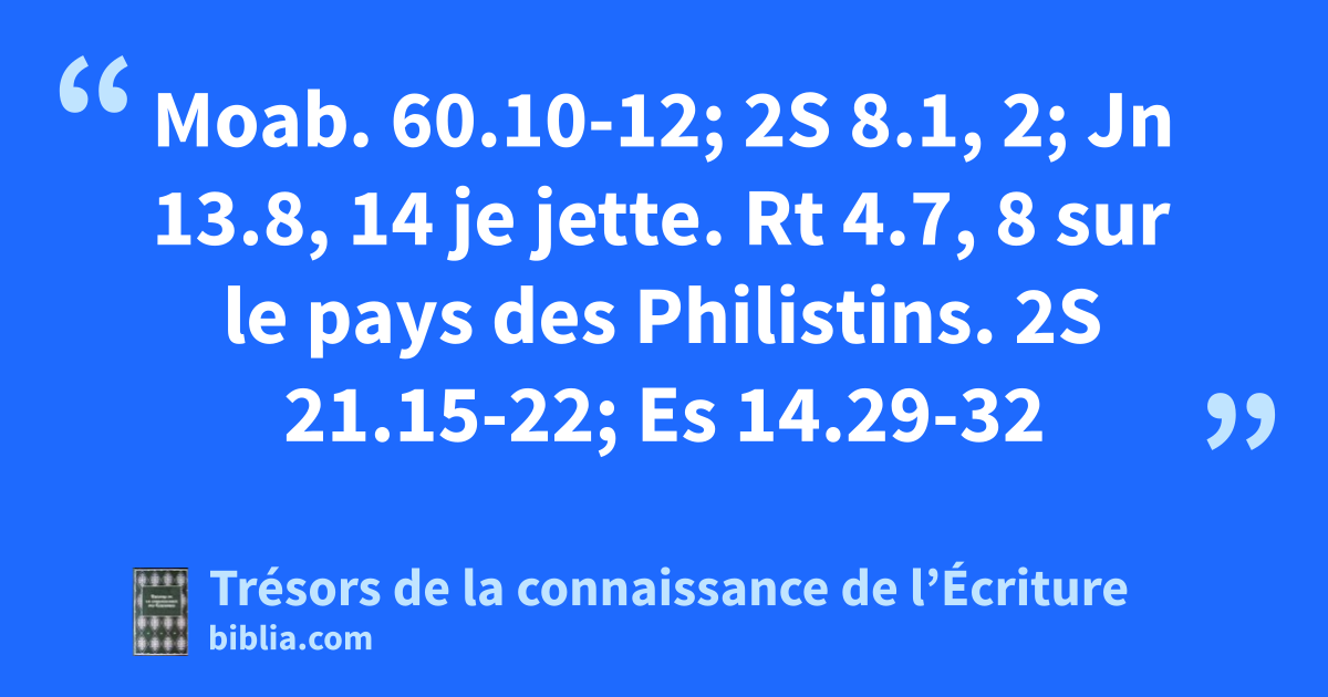 Moab. 60.10-12; 2S 8.1, 2; Jn 13.8, 14 je jette. Rt 4.7, 8 sur le pays des Philistins. 2S 21.15-22; Es 14.29-32