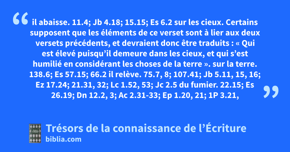 il abaisse. 11.4; Jb 4.18; 15.15; Es 6.2 sur les cieux. Certains supposent que les éléments de ce verset sont à lier aux deux versets précédents, et devraient donc être traduits : « Qui est élevé puisqu’il demeure dans les cieux, et qui s’est humilié en considérant les choses de la terre ». sur la terre. 138.6; Es 57.15; 66.2