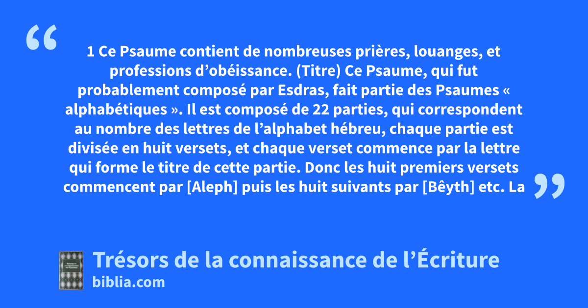 (Titre) Ce Psaume, qui fut probablement composé par Esdras, fait partie des Psaumes « alphabétiques ». Il est composé de 22 parties, qui correspondent au nombre des lettres de l’alphabet hébreu, chaque partie est divisée en huit versets, et chaque verset commence par la lettre qui forme le titre de cette partie. Donc les huit premiers versets commencent par [Aleph] puis les huit suivants par [Bêyth] etc. La composition en est élégante, et utile. Les principaux sujets en sont l’excellence des lois de Dieu, et le bonheur de ceux qui les observent. ALEPH heureux ceux. 1.1-3; 32.1, 2; 112.1; 128.1; Mt 5.3-12; Lc 11.28; Jn 13.17; Jc 1.25; Ap 22.14 qui sont intègres. Ou : parfaits, ou : sincères. 2R 20.3; 2Ch 31.20, 21; Jb 1.1, 8; Jn 1.47; Ac 24.16; 2Co 1.12; Tt 2.11, 12 qui marchent. Ez 11.20; Os 14.9; Lc 1.6; 1Th 4.1, 2
