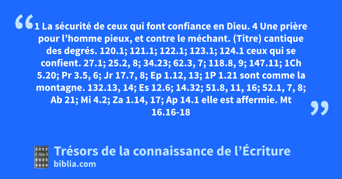 (Titre) cantique des degrés. 120.1; 121.1; 122.1; 123.1; 124.1 ceux qui se confient. 27.1; 25.2, 8; 34.23; 62.3, 7; 118.8, 9; 147.11; 1Ch 5.20; Pr 3.5, 6; Jr 17.7, 8; Ep 1.12, 13; 1P 1.21 sont comme la montagne. 132.13, 14; Es 12.6; 14.32; 51.8, 11, 16; 52.1, 7, 8; Ab 21; Mi 4.2; Za 1.14, 17; Ap 14.1 elle est affermie. Mt 16.16-18