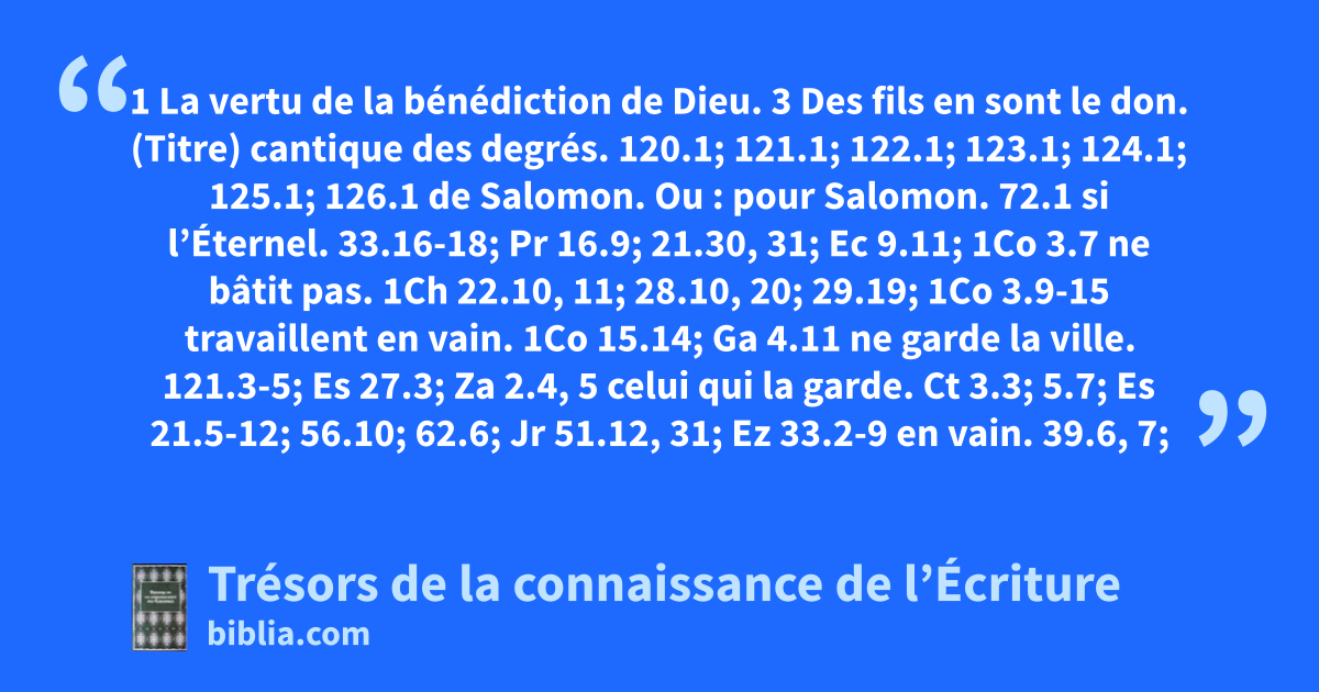 (Titre) cantique des degrés. 120.1; 121.1; 122.1; 123.1; 124.1; 125.1; 126.1 de Salomon. Ou : pour Salomon. 72.1 si l’Éternel. 33.16-18; Pr 16.9; 21.30, 31; Ec 9.11; 1Co 3.7 ne bâtit pas. 1Ch 22.10, 11; 28.10, 20; 29.19; 1Co 3.9-15 travaillent en vain. 1Co 15.14; Ga 4.11 ne garde la ville. 121.3-5; Es 27.3; Za 2.4, 5 celui qui la garde. Ct 3.3; 5.7; Es 21.5-12; 56.10; 62.6; Jr 51.12, 31; Ez 33.2-9