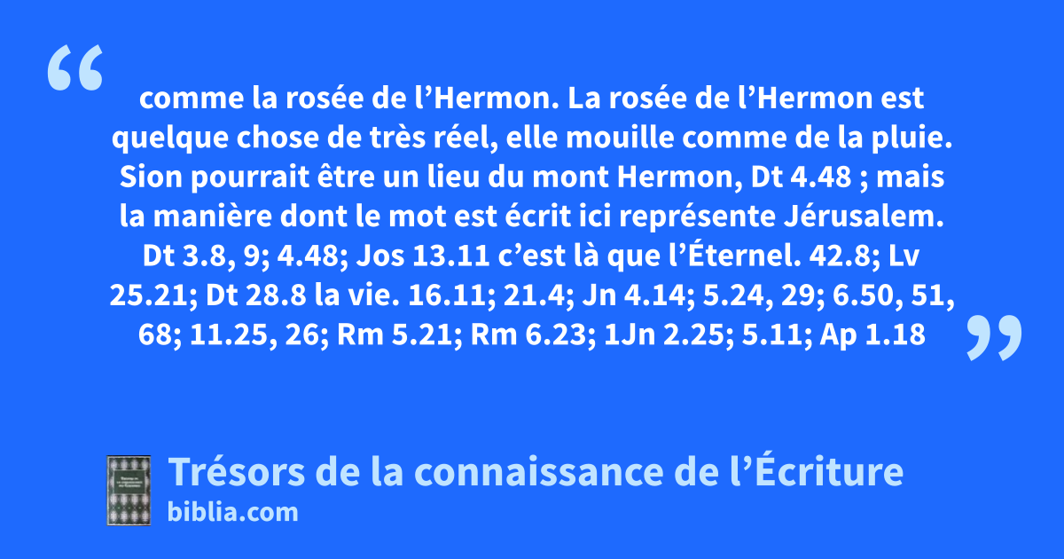comme la rosée de l’Hermon. La rosée de l’Hermon est quelque chose de très réel, elle mouille comme de la pluie. Sion pourrait être un lieu du mont Hermon, Dt 4.48 ; mais la manière dont le mot est écrit ici représente Jérusalem. Dt 3.8, 9; 4.48; Jos 13.11 c’est là que l’Éternel. 42.8; Lv 25.21; Dt 28.8 la vie. 16.11; 21.4; Jn 4.14; 5.24, 29; 6.50, 51, 68; 11.25, 26; Rm 5.21; Rm 6.23; 1Jn 2.25; 5.11; Ap 1.18