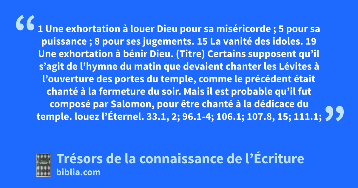 (Titre) Certains supposent qu’il s’agit de l’hymne du matin que devaient chanter les Lévites à l’ouverture des portes du temple, comme le précédent était chanté à la fermeture du soir. Mais il est probable qu’il fut composé par Salomon, pour être chanté à la dédicace du temple. louez l’Éternel. 33.1, 2; 96.1-4; 106.1; 107.8, 15; 111.1; 112.1; 113.1; 117.1, 2; 150.6 louez le nom. 7.18; 102.22; 113.2, 3; 148.13 Voir : Ex 34.5-7; Né 9.5 serviteurs de l’Éternel. 113.1; 134.1; 149.1-3