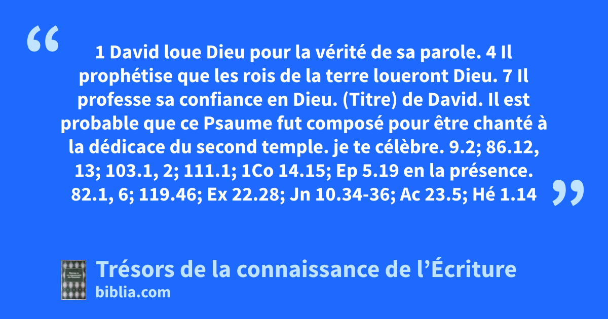 (Titre) de David. Il est probable que ce Psaume fut composé pour être chanté à la dédicace du second temple. je te célèbre. 9.2; 86.12, 13; 103.1, 2; 111.1; 1Co 14.15; Ep 5.19 en la présence. 82.1, 6; 119.46; Ex 22.28; Jn 10.34-36; Ac 23.5; Hé 1.14