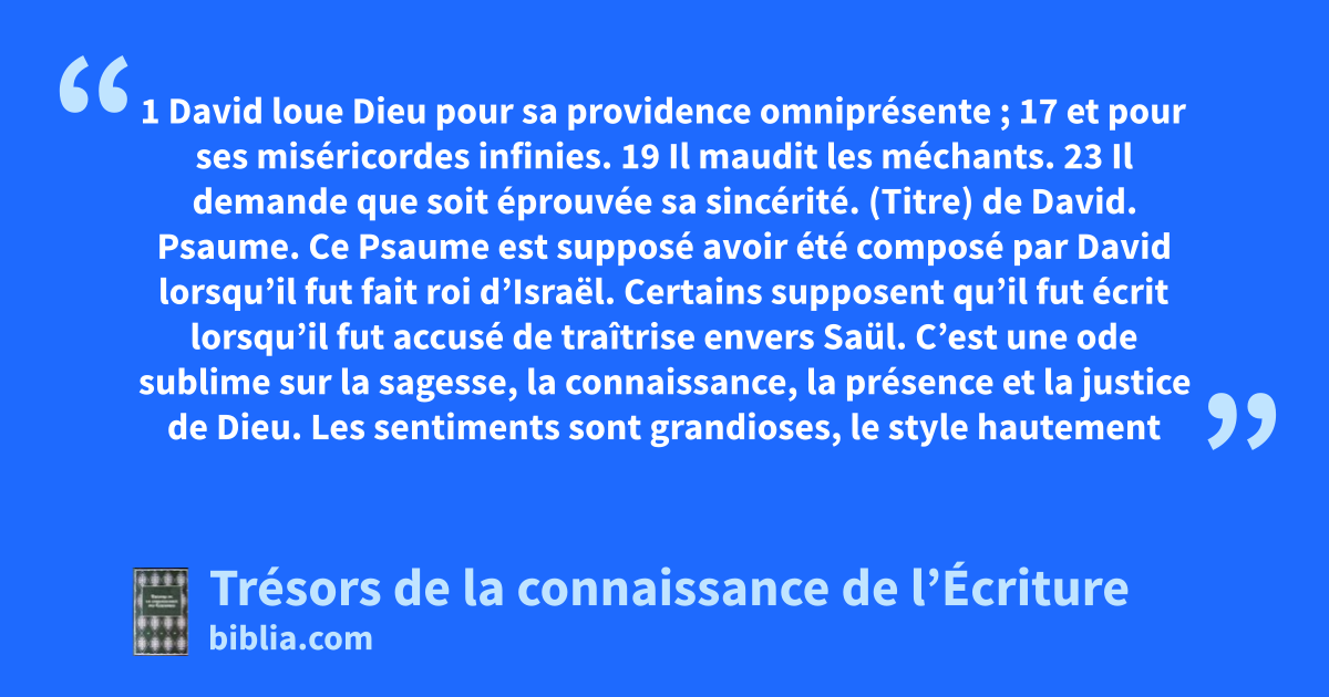 (Titre) de David. Psaume. Ce Psaume est supposé avoir été composé par David lorsqu’il fut fait roi d’Israël. Certains supposent qu’il fut écrit lorsqu’il fut accusé de traîtrise envers Saül. C’est une ode sublime sur la sagesse, la connaissance, la présence et la justice de Dieu. Les sentiments sont grandioses, le style hautement élevé, les images sont diverses, belles, et expressives. tu me sondes. 23; 11.4, 5; 17.3; 44.22; 1R 8.39; 1Ch 28.9; Jr 12.3; 17.9, 10; Jn 21.17; Hé 4.13; Ap 2.18, 23