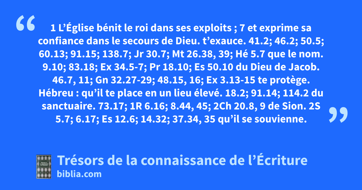 1 L’Église bénit le roi dans ses exploits ; 7 et exprime sa confiance dans le secours de Dieu.