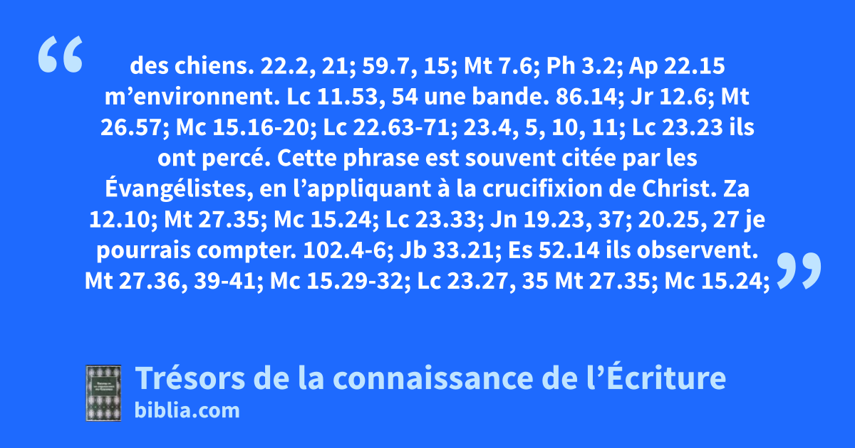 des chiens. 22.2, 21; 59.7, 15; Mt 7.6; Ph 3.2; Ap 22.15 m’environnent. Lc 11.53, 54 une bande. 86.14; Jr 12.6; Mt 26.57; Mc 15.16-20; Lc 22.63-71; 23.4, 5, 10, 11; Lc 23.23 ils ont percé. Cette phrase est souvent citée par les Évangélistes, en l’appliquant à la crucifixion de Christ. Za 12.10; Mt 27.35; Mc 15.24; Lc 23.33; Jn 19.23, 37; 20.25, 27