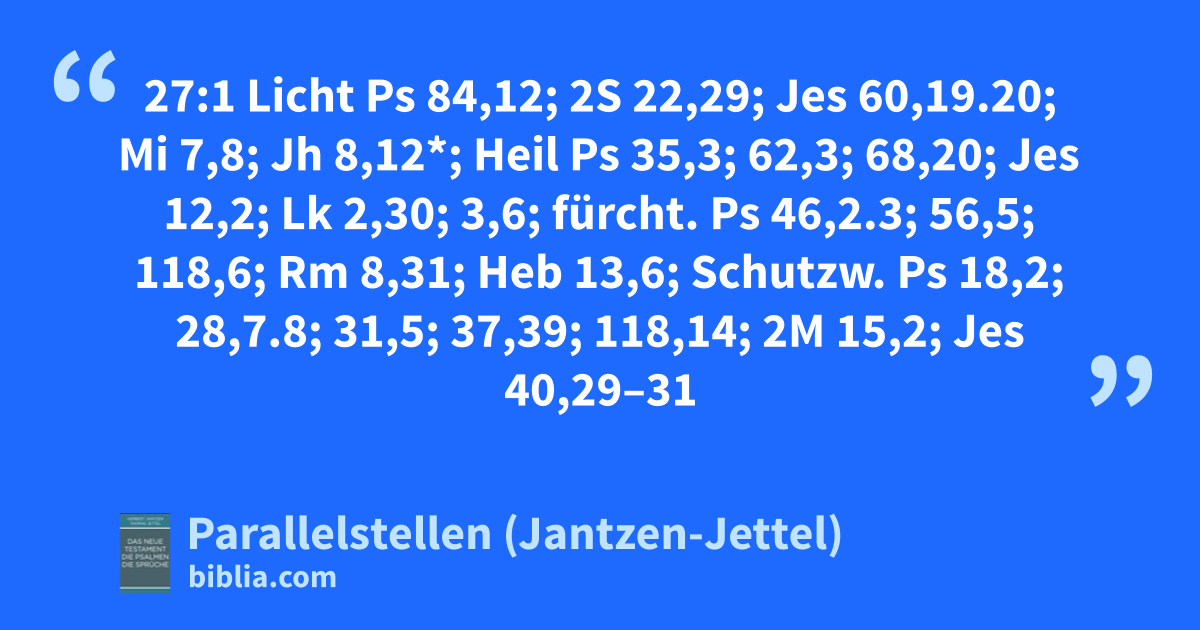 27:1 Licht Ps 84,12; 2S 22,29; Jes 60,19.20; Mi 7,8; Jh 8,12*; Heil Ps 35,3; 62,3; 68,20; Jes 12,2; Lk 2,30; 3,6; fürcht. Ps 46,2.3; 56,5; 118,6; Rm 8,31; Heb 13,6; Schutzw. Ps 18,2; 28,7.8; 31,5; 37,39; 118,14; 2M 15,2; Jes 40,29–31