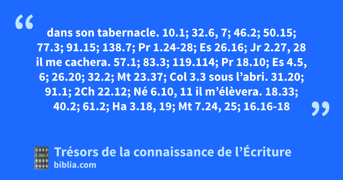 dans son tabernacle. 10.1; 32.6, 7; 46.2; 50.15; 77.3; 91.15; 138.7; Pr 1.24-28; Es 26.16; Jr 2.27, 28 il me cachera. 57.1; 83.3; 119.114; Pr 18.10; Es 4.5, 6; 26.20; 32.2; Mt 23.37; Col 3.3 sous l’abri. 31.20; 91.1; 2Ch 22.12; Né 6.10, 11 il m’élèvera. 18.33; 40.2; 61.2; Ha 3.18, 19; Mt 7.24, 25; 16.16-18