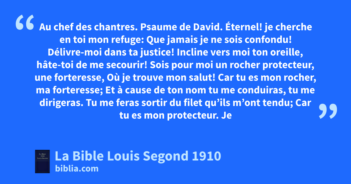 About La Bible Louis Segond 1910Publiée à l'origine en 1888 par Louis Segond par subvention de la Compagnie des pasteurs de Genève, la version de 1910 en constitue la première révision majeure après sa mort. Elle demeure l'une des Bibles françaises les plus utilisées de nos jours. |