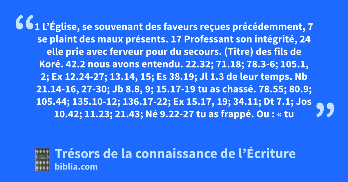 (Titre) des fils de Koré. 42.2 nous avons entendu. 22.32; 71.18; 78.3-6; 105.1, 2; Ex 12.24-27; 13.14, 15; Es 38.19; Jl 1.3 de leur temps. Nb 21.14-16, 27-30; Jb 8.8, 9; 15.17-19