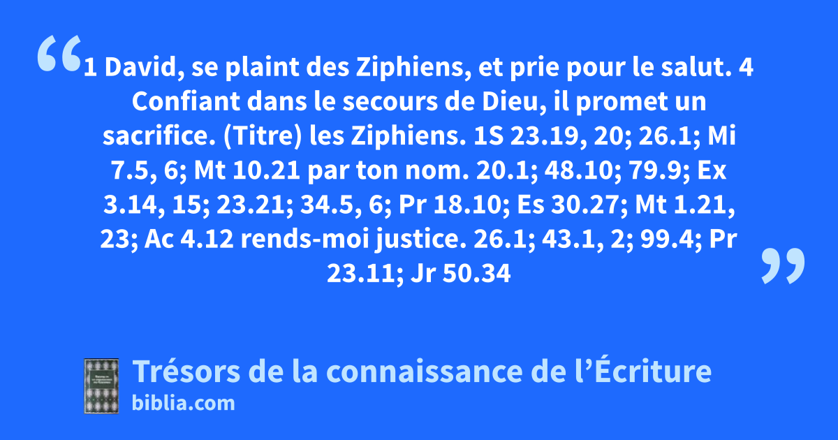 (Titre) les Ziphiens. 1S 23.19, 20; 26.1; Mi 7.5, 6; Mt 10.21 par ton nom. 20.1; 48.10; 79.9; Ex 3.14, 15; 23.21; 34.5, 6; Pr 18.10; Es 30.27; Mt 1.21, 23; Ac 4.12 rends-moi justice. 26.1; 43.1, 2; 99.4; Pr 23.11; Jr 50.34