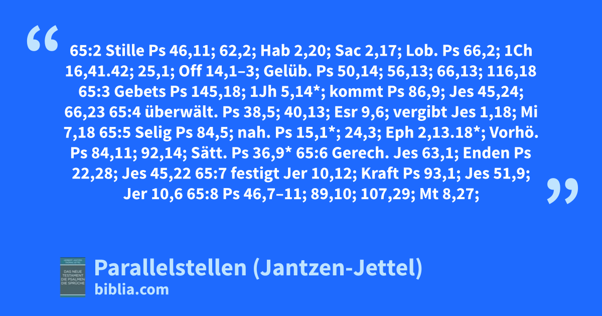 65:2 Stille Ps 46,11; 62,2; Hab 2,20; Sac 2,17; Lob. Ps 66,2; 1Ch 16,41.42; 25,1; Off 14,1–3; Gelüb. Ps 50,14; 56,13; 66,13; 116,18
