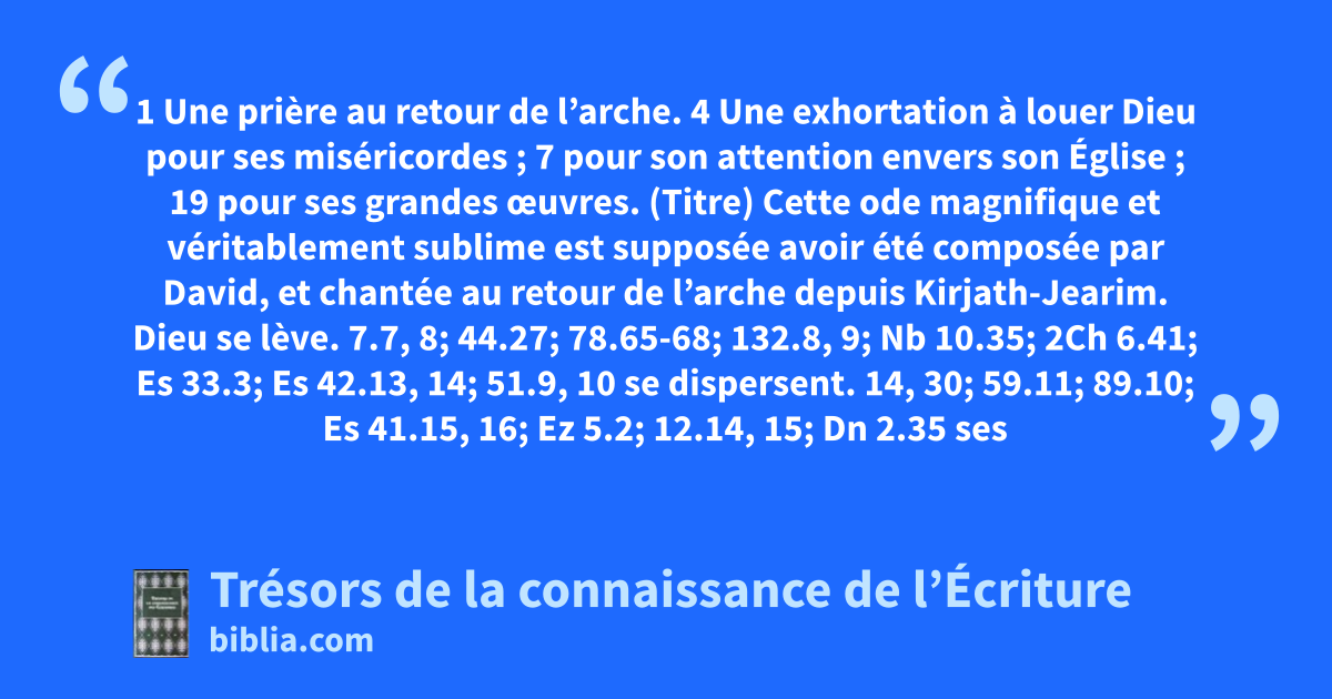 (Titre) Cette ode magnifique et véritablement sublime est supposée avoir été composée par David, et chantée au retour de l’arche depuis Kirjath-Jearim. Dieu se lève. 7.7, 8; 44.27; 78.65-68; 132.8, 9; Nb 10.35; 2Ch 6.41; Es 33.3; Es 42.13, 14; 51.9, 10 se dispersent. 14, 30; 59.11; 89.10; Es 41.15, 16; Ez 5.2; 12.14, 15; Dn 2.35 ses adversaires fuient. 21.8; Ex 20.5; Dt 7.10; Jn 14.23, 24