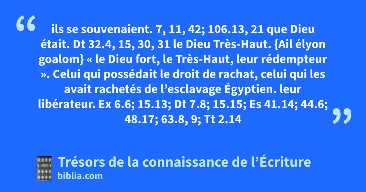 ils se souvenaient. 7, 11, 42; 106.13, 21 que Dieu était. Dt 32.4, 15, 30, 31 le Dieu Très-Haut. {Ail élyon goalom} « le Dieu fort, le Très-Haut, leur rédempteur ». Celui qui possédait le droit de rachat, celui qui les avait rachetés de l’esclavage Égyptien. leur libérateur. Ex 6.6; 15.13; Dt 7.8; 15.15; Es 41.14; 44.6; 48.17; 63.8, 9; Tt 2.14