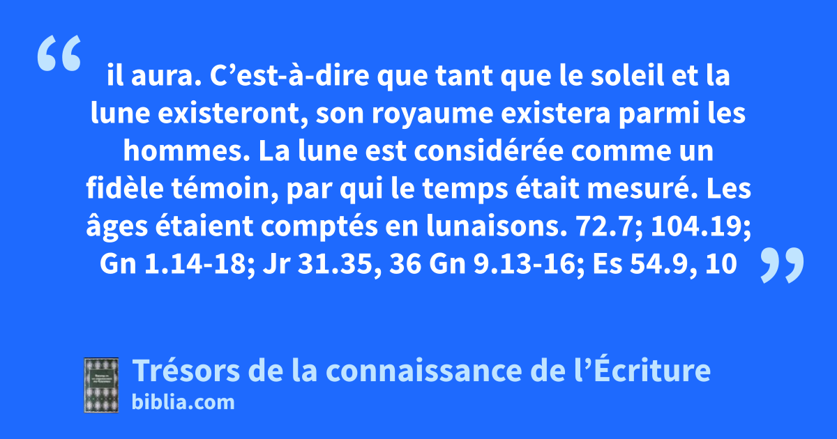 il aura. C’est-à-dire que tant que le soleil et la lune existeront, son royaume existera parmi les hommes. La lune est considérée comme un fidèle témoin, par qui le temps était mesuré. Les âges étaient comptés en lunaisons. 72.7; 104.19; Gn 1.14-18; Jr 31.35, 36 Gn 9.13-16; Es 54.9, 10