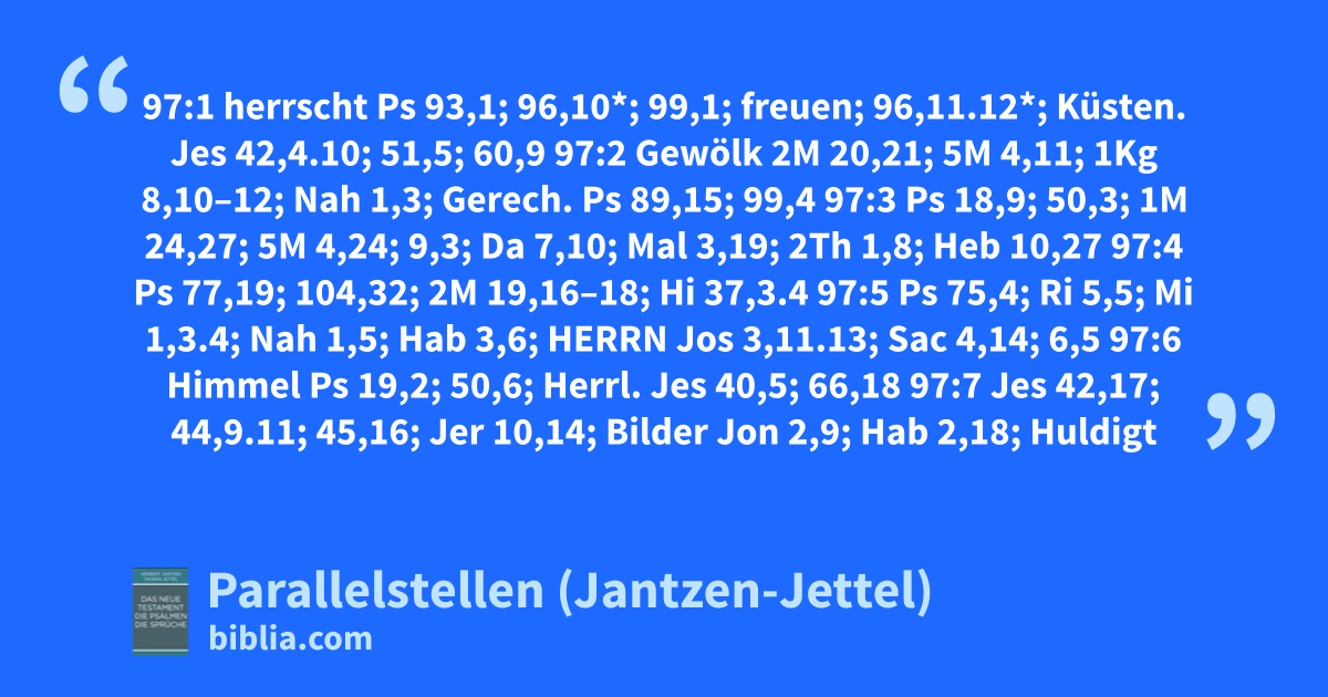 97:1 herrscht Ps 93,1; 96,10*; 99,1; freuen; 96,11.12*; Küsten. Jes 42,4.10; 51,5; 60,9