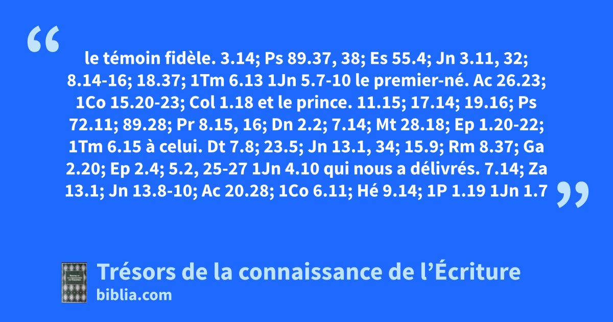 le témoin fidèle. 3.14; Ps 89.37, 38; Es 55.4; Jn 3.11, 32; 8.14-16; 18.37; 1Tm 6.13 1Jn 5.7-10 le premier-né. Ac 26.23; 1Co 15.20-23; Col 1.18 et le prince. 11.15; 17.14; 19.16; Ps 72.11; 89.28; Pr 8.15, 16; Dn 2.2; 7.14; Mt 28.18; Ep 1.20-22; 1Tm 6.15 à celui. Dt 7.8; 23.5; Jn 13.1, 34; 15.9; Rm 8.37; Ga 2.20; Ep 2.4; 5.2, 25-27 1Jn 4.10 qui nous a délivrés. 7.14; Za 13.1; Jn 13.8-10; Ac 20.28; 1Co 6.11; Hé 9.14; 1P 1.19 1Jn 1.7