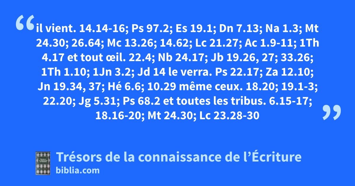 il vient. 14.14-16; Ps 97.2; Es 19.1; Dn 7.13; Na 1.3; Mt 24.30; 26.64; Mc 13.26; 14.62; Lc 21.27; Ac 1.9-11; 1Th 4.17 et tout œil. 22.4; Nb 24.17; Jb 19.26, 27; 33.26; 1Th 1.10; 1Jn 3.2; Jd 14 le verra. Ps 22.17; Za 12.10; Jn 19.34, 37; Hé 6.6; 10.29 même ceux. 18.20; 19.1-3; 22.20; Jg 5.31; Ps 68.2 et toutes les tribus. 6.15-17; 18.16-20; Mt 24.30; Lc 23.28-30