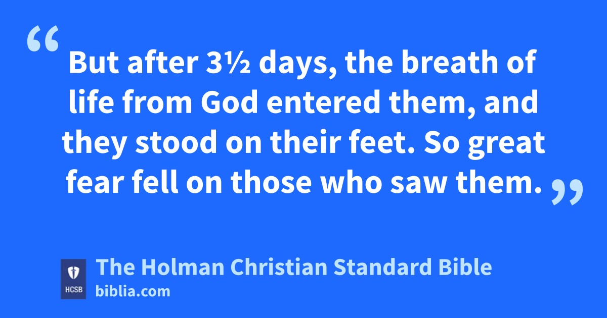 11 But after 3½ days, the breath s of life t from God entered them, and they stood on their feet. So great fear fell on those who saw them. 12 Then they heard u a loud voice from heaven saying to them, “Come up here.” They went up to heaven in a cloud, while their enemies watched them. v 13 At that moment a violent earthquake took place, w a tenth of the city fell, and 7,000 people were killed in the earthquake. The survivors were terrified and gave glory to the God of heaven. 14 The second woe x has passed. Take note: The third woe is coming quickly!