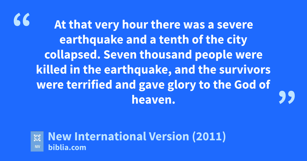 13 At that very hour there was a severe earthquakev and a tenth of the city collapsed. Seven thousand people were killed in the earthquake, and the survivors were terrified and gave gloryw to the God of heaven.x
