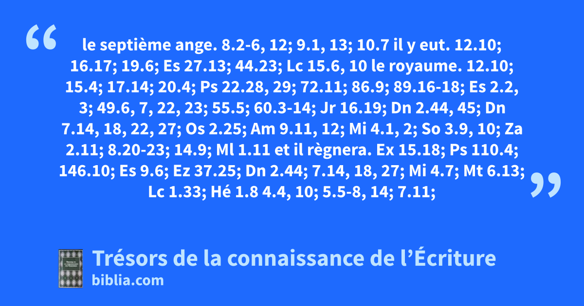 le septième ange. 8.2-6, 12; 9.1, 13; 10.7 il y eut. 12.10; 16.17; 19.6; Es 27.13; 44.23; Lc 15.6, 10 le royaume. 12.10; 15.4; 17.14; 20.4; Ps 22.28, 29; 72.11; 86.9; 89.16-18; Es 2.2, 3; 49.6, 7, 22, 23; 55.5; 60.3-14; Jr 16.19; Dn 2.44, 45; Dn 7.14, 18, 22, 27; Os 2.25; Am 9.11, 12; Mi 4.1, 2; So 3.9, 10; Za 2.11; 8.20-23; 14.9; Ml 1.11 et il règnera. Ex 15.18; Ps 110.4; 146.10; Es 9.6; Ez 37.25; Dn 2.44; 7.14, 18, 27; Mi 4.7; Mt 6.13; Lc 1.33; Hé 1.8