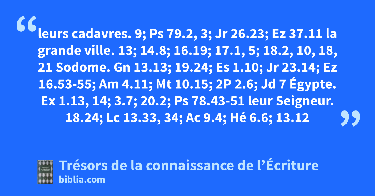 leurs cadavres. 9; Ps 79.2, 3; Jr 26.23; Ez 37.11 la grande ville. 13; 14.8; 16.19; 17.1, 5; 18.2, 10, 18, 21 Sodome. Gn 13.13; 19.24; Es 1.10; Jr 23.14; Ez 16.53-55; Am 4.11; Mt 10.15; 2P 2.6; Jd 7 Égypte. Ex 1.13, 14; 3.7; 20.2; Ps 78.43-51 leur Seigneur. 18.24; Lc 13.33, 34; Ac 9.4; Hé 6.6; 13.12