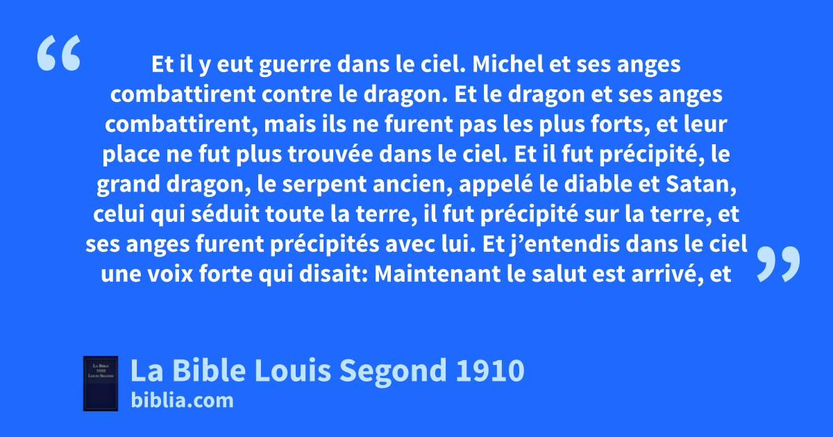 7Et il y eut guerre dans le ciel. Michel et ses anges combattirent contre le dragon. Et le dragon et ses anges combattirent, 8mais ils ne furent pas les plus forts, cet leur place ne fut plus trouvée dans le ciel. 9Et il fut précipité, dle grand dragon, le serpent ancien, appelé le diable et Satan, celui qui séduit toute la terre, il fut précipité sur la terre, et ses anges furent précipités avec lui. 10Et j’entendis dans le ciel une voix forte qui disait: Maintenant le salut est arrivé, et la puissance, et le règne de notre Dieu, et l’autorité de son Christ; car il a été précipité, l’accusateur de nos frères, celui qui les accusait devant notre Dieu jour et nuit. 11Ils l’ont vaincu à cause du sang de l’agneau et à cause de la parole de leur témoignage, et ils n’ont pas aimé leur vie jusqu’à craindre la mort. 12eC’est pourquoi réjouissez-vous, cieux, et vous qui habitez dans les cieux. fMalheur à la terre et à la mer! car le diable est descendu vers vous, animé d’une grande colère, sachant qu’il a peu de temps.