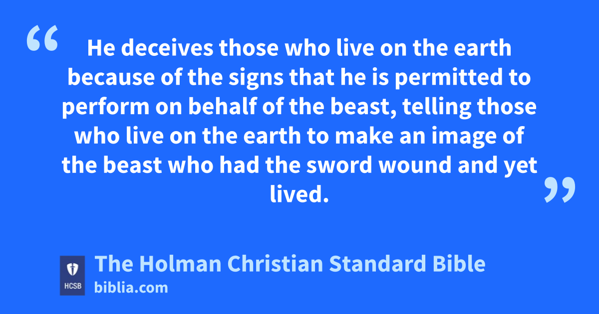 11 Then I saw another beast coming up out of the earth; he had two horns like a lamb, z a but he sounded like a dragon. 12 He exercises all the authority of the first beast on his behalf and compels the earth and those who live on it to worship the first beast, whose fatal wound was healed. 13 He also performs great signs, b even causing fire to come down from heaven to earth in front of people. c 14 He deceives those who live on the earth d because of the signs that he is permitted to perform on behalf of the beast, e telling those who live on the earth to make an image f of the beast who had the sword wound and yet lived. 15 He was permitted to give a spirit g to the image of the beast, so that the image of the beast could both speak and cause whoever would not worship the image of the beast to be killed. h 16 And he requires everyone—small and great, rich and poor, free and * slave—to be given a mark i on his right hand or on his forehead, j 17 so that no one can buy or sell unless he has the mark: the beast’s name or the number of his name.