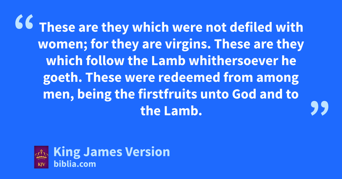 14 And I looked, and, lo, aa Lamb stood on bthe mount Sion, and with him can hundred forty and four thousand, dhaving his Father’s name written in their foreheads. 2 And I heard a voice from heaven, eas the voice of many waters, and fas the voice of a great thunder: and I heard the voice of harpers gharping with their harps: 3 And they sung as it were ha new song before the throne, and before gthe four beasts, and the elders: and ino man could learn that song but cthe hundred and forty and four thousand, hwhich were redeemed from the earth. 4 These are they which jwere not defiled with women; for kthey are virgins. These are they jlwhich follow the Lamb whithersoever he goeth. These †hwere redeemed from among men, being mthe firstfruits unto God and to the Lamb. 5 And nin their mouth was found no guile: for they are owithout fault before the throne of God.