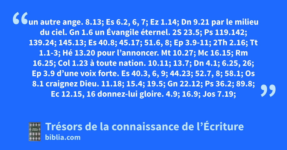 un autre ange. 8.13; Es 6.2, 6, 7; Ez 1.14; Dn 9.21 par le milieu du ciel. Gn 1.6 un Évangile éternel. 2S 23.5; Ps 119.142; 139.24; 145.13; Es 40.8; 45.17; 51.6, 8; Ep 3.9-11; 2Th 2.16; Tt 1.1-3; Hé 13.20 pour l’annoncer. Mt 10.27; Mc 16.15; Rm 16.25; Col 1.23 à toute nation. 10.11; 13.7; Dn 4.1; 6.25, 26; Ep 3.9