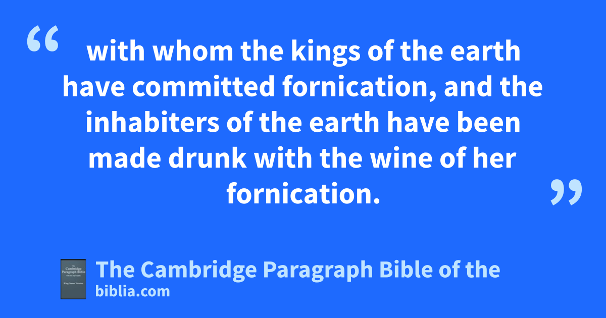 XVII. And there came aone of aathe seven angels which had the seven vials, and talked with me, saying unto me, aCome hither; bI will shew unto thee the judgment of cthe great whore dthat sitteth upon many waters: 2 ewith whom the kings of the earth have committed fornication, and fthe inhabiters of the earth ghave been hmade drunk with the wine of her fornication. 3 So he carried me away iin the spirit kinto the wilderness: and I saw a woman sit upon a lscarlet coloured beast, full of mnames of blasphemy, mnhaving seven heads and moten horns. 4 And the woman was parrayed in qpurple and lscarlet colour, and * decked rwith gold and rprecious stone and spearls, thaving a golden cup in her hand gfull of abominations and filthiness of her fornication: 5 and upon her forehead was a name written, uMYSTERY, gBABYLON THE GREAT, THE MOTHER OF * HARLOTS AND vABOMINATIONS OF THE EARTH. 6 And I saw wthe woman hdrunken xwith the blood of the saints, and with the blood of ythe martyrs zof Jesus: and when I saw her, I wondered with great admiration. 7 And the angel said unto me, Wherefore didst thou marvel? I will tell thee uthe mystery of the woman, and of the beast that carrieth her, which hath nthe seven heads and oten horns. 8 The beast that thou sawest awas, and is not; and bshall ascend out of cthe bottomless pit, and dgo into perdition: and ethey that dwell on the earth fshall wonder, gwhose names were not written in the book of life gfrom the foundation of the world, when they behold the beast that was, and is not, and yet is. 9 And hhere is the mind which hath wisdom. iThe seven heads are seven mountains, on which the woman sitteth. 10 And there are seven kings: five are fallen, and one is, and the other is not yet come; and when he cometh, he must continue a short space. 11 And athe beast that was, and is not, even he is the eighth, and is of the seven, and dgoeth into perdition. 12 And ikthe ten horns which thou sawest are ten kings, which have received no kingdom as yet; but receive power as kings lone hour with the beast. 13 These mhave one mind, and shall give their power and strength unto the beast. 14 These nshall make war with the Lamb, and othe Lamb shall overcome them: for he is pqLord of lords, and prKing of kings: and rrthey that are with him are stcalled, and suchosen, and vfaithful. 15 And he saith unto me, wThe waters which thou sawest, where the whore sitteth, are xpeoples, and multitudes, and nations, and tongues. 16 And ythe ten horns which thou sawest upon the beast, zthese shall hate the whore, and ashall make her desolate and bnaked, and bbshall eat her flesh, and cburn her with fire. 17 For God hath dput in their hearts to fulfil his will, and mto agree, and egive their kingdom unto the beast, funtil the words of God shall be fulfilled. 18 And the woman which thou sawest is gthat great city, which reigneth over the kings of the earth.