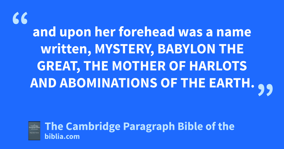 XVII. And there came aone of aathe seven angels which had the seven vials, and talked with me, saying unto me, aCome hither; bI will shew unto thee the judgment of cthe great whore dthat sitteth upon many waters: 2 ewith whom the kings of the earth have committed fornication, and fthe inhabiters of the earth ghave been hmade drunk with the wine of her fornication. 3 So he carried me away iin the spirit kinto the wilderness: and I saw a woman sit upon a lscarlet coloured beast, full of mnames of blasphemy, mnhaving seven heads and moten horns. 4 And the woman was parrayed in qpurple and lscarlet colour, and * decked rwith gold and rprecious stone and spearls, thaving a golden cup in her hand gfull of abominations and filthiness of her fornication: 5 and upon her forehead was a name written, uMYSTERY, gBABYLON THE GREAT, THE MOTHER OF * HARLOTS AND vABOMINATIONS OF THE EARTH. 6 And I saw wthe woman hdrunken xwith the blood of the saints, and with the blood of ythe martyrs zof Jesus: and when I saw her, I wondered with great admiration. 7 And the angel said unto me, Wherefore didst thou marvel? I will tell thee uthe mystery of the woman, and of the beast that carrieth her, which hath nthe seven heads and oten horns. 8 The beast that thou sawest awas, and is not; and bshall ascend out of cthe bottomless pit, and dgo into perdition: and ethey that dwell on the earth fshall wonder, gwhose names were not written in the book of life gfrom the foundation of the world, when they behold the beast that was, and is not, and yet is. 9 And hhere is the mind which hath wisdom. iThe seven heads are seven mountains, on which the woman sitteth. 10 And there are seven kings: five are fallen, and one is, and the other is not yet come; and when he cometh, he must continue a short space. 11 And athe beast that was, and is not, even he is the eighth, and is of the seven, and dgoeth into perdition. 12 And ikthe ten horns which thou sawest are ten kings, which have received no kingdom as yet; but receive power as kings lone hour with the beast. 13 These mhave one mind, and shall give their power and strength unto the beast. 14 These nshall make war with the Lamb, and othe Lamb shall overcome them: for he is pqLord of lords, and prKing of kings: and rrthey that are with him are stcalled, and suchosen, and vfaithful. 15 And he saith unto me, wThe waters which thou sawest, where the whore sitteth, are xpeoples, and multitudes, and nations, and tongues. 16 And ythe ten horns which thou sawest upon the beast, zthese shall hate the whore, and ashall make her desolate and bnaked, and bbshall eat her flesh, and cburn her with fire. 17 For God hath dput in their hearts to fulfil his will, and mto agree, and egive their kingdom unto the beast, funtil the words of God shall be fulfilled. 18 And the woman which thou sawest is gthat great city, which reigneth over the kings of the earth.