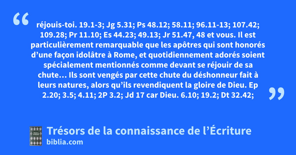 réjouis-toi. 19.1-3; Jg 5.31; Ps 48.12; 58.11; 96.11-13; 107.42; 109.28; Pr 11.10; Es 44.23; 49.13; Jr 51.47, 48 et vous. Il est particulièrement remarquable que les apôtres qui sont honorés d’une façon idolâtre à Rome, et quotidiennement adorés soient spécialement mentionnés comme devant se réjouir de sa chute… Ils sont vengés par cette chute du déshonneur fait à leurs natures, alors qu’ils revendiquent la gloire de Dieu. Ep 2.20; 3.5; 4.11; 2P 3.2; Jd 17 car Dieu. 6.10; 19.2; Dt 32.42; Ps 18.48; 94.1; Es 26.21; Lc 11.49, 50; 18.7, 8