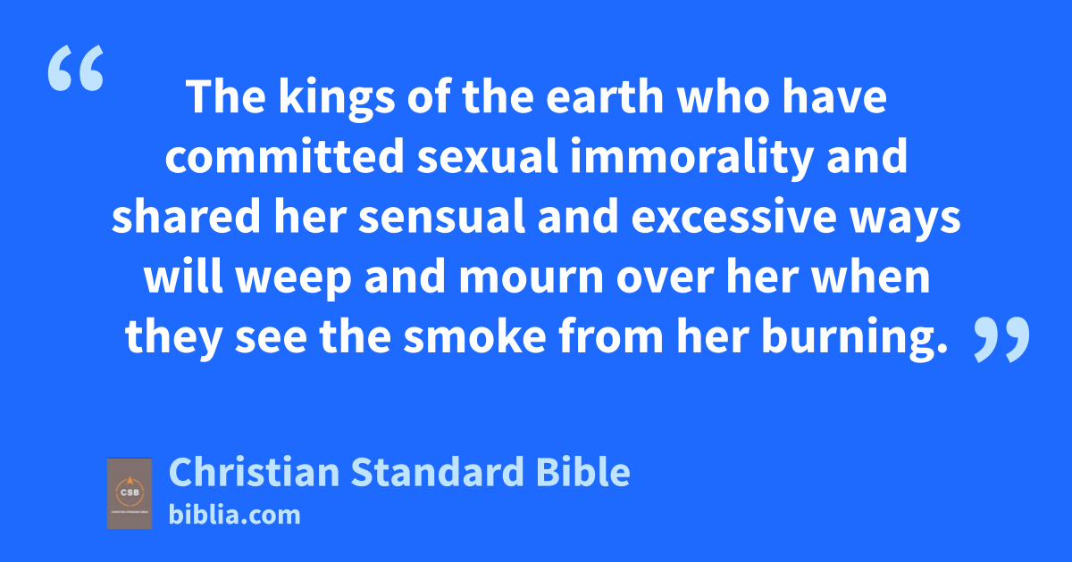9 The kings of the earth who have committed sexual immorality and shared her sensual and excessive ways will weep and mourn over her when they see the smoke from her burning. 10 They will stand far off in fear of her torment,n saying,