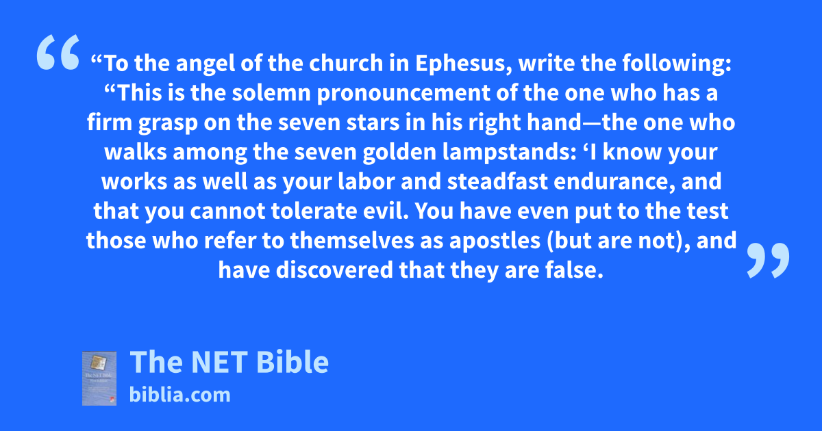 “This is the solemn pronouncement of3 the one who has a firm grasp on4 the seven stars in his right hand5—the one who walks among the seven golden6 lampstands: 2:2 ‘I know your works as well as your7 labor and steadfast endurance, and that you cannot tolerate8 evil. You have even put to the test9 those who refer to themselves as apostles (but are not), and have discovered that they are false. 2:3 I am also aware10 that you have persisted steadfastly,11 endured much for the sake of my name, and have not grown weary. 2:4 But I have this against you: You have departed12 from your first love! 2:5 Therefore, remember from what high state13 you have fallen and repent! Do14 the deeds you did at the first;15 if not, I will come to you and remove your lampstand from its place—that is, if you do not repent.16 2:6 But you do have this going for you:17 You hate what the Nicolaitans18 practice19—practices I also hate. 2:7 The one who has an ear had better hear what the Spirit says to the churches. To the one who conquers,20 I will permit21 him to eat from the tree of life that is22 in the paradise of God.’23