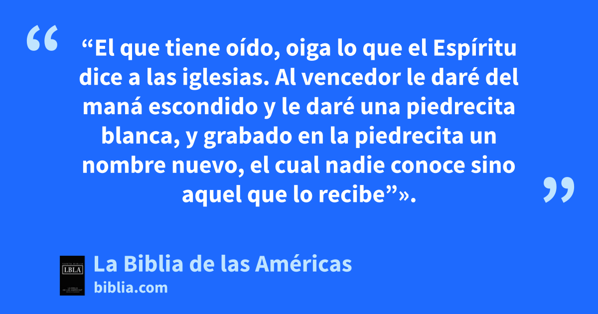 17 “El que tiene oídoa, oiga lo que el Espíritu dice a las iglesias. Al vencedor1a le daré del maná escondidob y le daré una piedrecita blanca, y grabado en la piedrecitac un nombre nuevo, el cual nadie conoce sino aquel que lo recibed”».