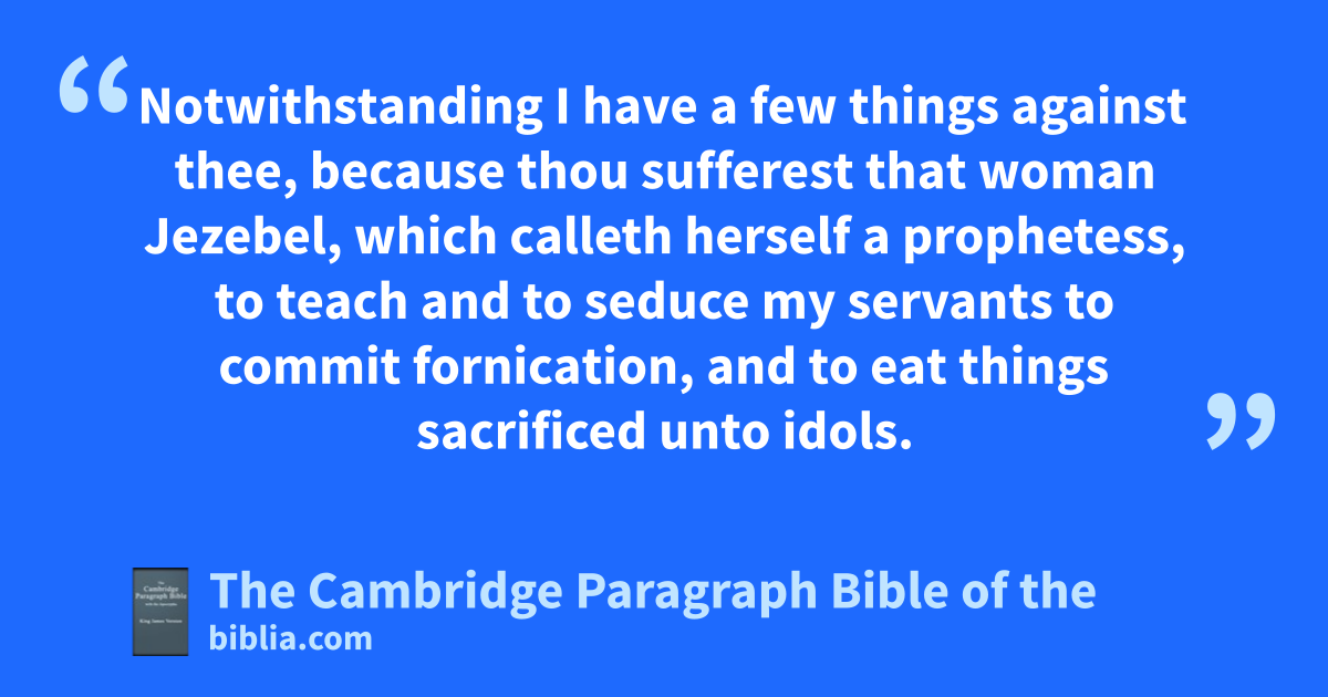 18 And unto jthe angel of the church in yThyatira write; These things saith the Son of God, zwho hath his eyes like unto a flame of fire, and ahis feet are like fine brass; 19 mI know thy works, and charity, and service, and faith, and thy patience, and thy works; and the last to be more than the first. 20 bNotwithstanding I have a few things against thee, because thou sufferest that woman cJezebel, which calleth herself a prophetess, to teach and to seduce my servants to decommit fornication, and dto eat things sacrificed unto idols. 21 And fI gave her space to repent of her fornication; and she repented not. 22 Behold, I will gcast her into a bed, and them that commit adultery with her into great tribulation, except they repent of their deeds. 23 And I will kill her children with death; and all the churches shall know that I am he hwhich searcheth ithe reins and ihhearts: and kI will give unto every one of you according to your works. 24 But unto you I say, and unto the rest in lThyatira, as many as have not this doctrine, and which have not known the depths of mSatan, as they speak; I will nput upon you none other burden. 25 But othat which ye have already hold fast till ooI come. 26 pAnd he that overcometh, and keepeth my works qunto the end, to rhim will I give power over the nations: 27 and she shall trule them with a rod of iron; sas the vessels of a potter shall they be broken to shivers: ueven as I received of my Father. 28 And I will give him wthe morning star. 29 xHe that hath an ear, let him hear what the Spirit saith unto the churches.