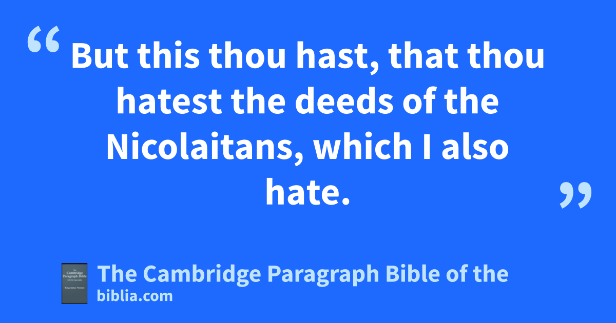II. Unto athe angel of the church of bEphesus write; These things saith che that holdeth the seven stars in his right hand, who walketh din the midst of the seven golden candlesticks; 2 eI know thy works, and thy labour, and thy patience, and how thou canst not fbear them which are evil: and gthou hast tried them hwhich say they are iapostles, and are not, and hast found them liars: 3 and hast fjborne, and hast patience, and for my name’s sake hast laboured, and khast not fainted. 4 Nevertheless I have somewhat against thee, because thou hast left lthy first love. 5 Remember therefore from whence thou art fallen, and repent, and do the first works; or else mI will come unto thee quickly, and will remove nthy candlestick out of his place, except thou repent. 6 But this thou hast, that thou hatest the deeds of othe Nicolaitans, which I also hate. 7 pHe that hath an ear, let him hear what the Spirit saith unto the churches; qTo him that overcometh will I give to eat of rthe tree of life, which is in the midst of sthe paradise of God.