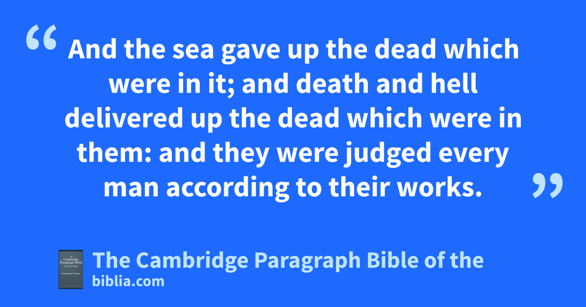 11 And I saw a great white throne, and him that sat on it, from whose face othe earth and the heaven fled away; and pthere was found no place for them. 12 And I saw the dead, qsmall and great, stand before God; and rthe books were opened: and another book was opened, swhich is the book of life: and tthe dead were judged out of those things which were written in the books, uaccording to their works. 13 And the sea gave up the dead which were in it; and vdeath and * hell wdelivered up the dead which were in them: and they were judged uevery man according to their works. 14 And xdeath and hell mwere cast into the lake of fire. This is ythe second death. 15 And whosoever was not found written in sthe book of life mwas cast into the lake of fire.