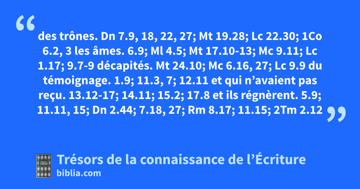 des trônes. Dn 7.9, 18, 22, 27; Mt 19.28; Lc 22.30; 1Co 6.2, 3 les âmes. 6.9; Ml 4.5; Mt 17.10-13; Mc 9.11; Lc 1.17; 9.7-9 décapités. Mt 24.10; Mc 6.16, 27; Lc 9.9 du témoignage. 1.9; 11.3, 7; 12.11 et qui n’avaient pas reçu. 13.12-17; 14.11; 15.2; 17.8 et ils régnèrent. 5.9; 11.11, 15; Dn 2.44; 7.18, 27; Rm 8.17; 11.15; 2Tm 2.12