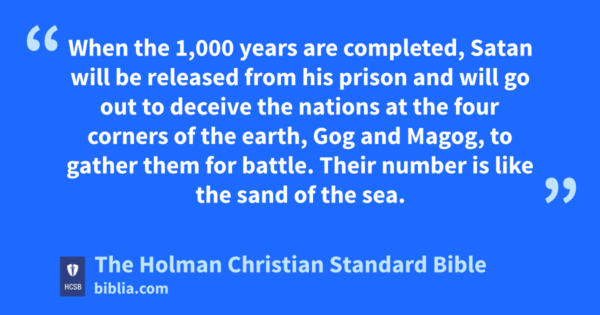 7 When the 1,000 years are completed, Satan will be released from his prison 8 and will go out to deceive the nations y at the four corners of the earth, z Gog and Magog, to gather them for battle. a Their number is like the sand of the sea. b 9 They came up over the surface of the earth and surrounded the encampment of the * saints, the beloved city. c Then fire came down from heaven d and consumed them. e 10 The Devil who deceived them was thrown into the lake of fire and sulfur where the beast and the false prophet are, f and they will be tormented day and night forever and ever. g