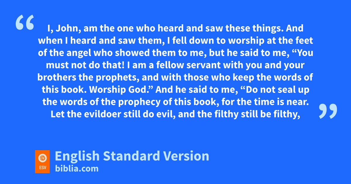 8 I, rJohn, am the one who heard and saw these things. And when I heard and saw them, sI fell down to worship at the feet of the angel who showed them to me, 9 sbut he said to me, “You must not do that! I am a fellow servant with you and your brothers the prophets, and with those mwho keep the words of this book. Worship God.”