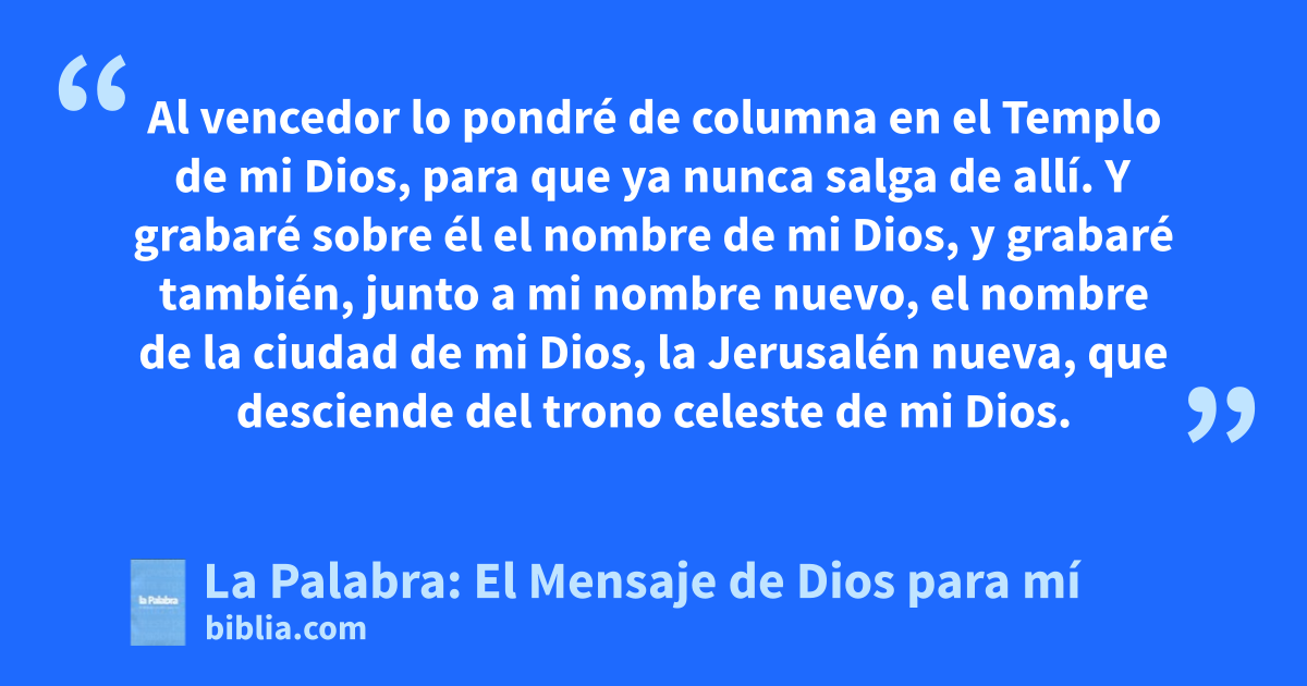 12 Al vencedor lo pondré de columna en el Templo de mi Dios, para que ya nunca salga de allí. Y grabaré sobre él el nombre de mi Dios, y grabaré también, junto a mi nombre nuevo, el nombre de la ciudad de mi Dios, la Jerusalén nueva, que desciende del trono celeste de mi Dios.