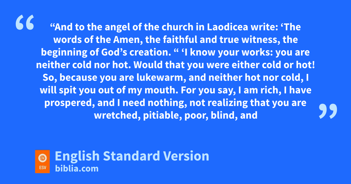 15 “ ‘I know your works: you are neither cold nor hot. sWould that you were either cold or hot! 16 So, because you are lukewarm, and neither hot nor cold, I will spit you out of my mouth. 17 tFor you say, I am rich, I have prospered, and I need nothing, not realizing that you are wretched, pitiable, poor, ublind, and naked. 18 I counsel you vto buy from me gold refined by fire, so that you may be rich, and wwhite garments so that you may clothe yourself and xthe shame of your nakedness may not be seen, and salve to anoint your eyes, uso that you may see. 19 yThose whom I love, I reprove and discipline, so be zealous and repent. 20 Behold, I stand at the door and zknock. aIf anyone hears my voice and opens the door, bI will come in to him and eat with him, and he with me. 21 cThe one who conquers, dI will grant him to sit with me on my throne, as eI also conquered and sat down with my Father on his throne. 22 pHe who has an ear, let him hear what the Spirit says to the churches.’ ”