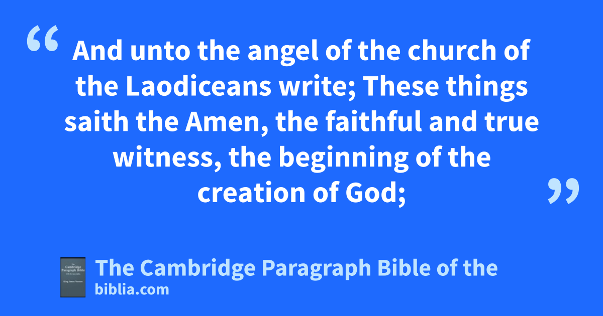 14 And unto bthe angel of the church * of the cLaodiceans write; These things saith the dAmen, ethe faithful and ftrue witness, gthe beginning of the creation of God; 15 hI know thy works, that thou art neither cold nor hot: iI would thou wert cold or hot. 16 So then because thou art lukewarm, and neither cold nor hot, I will spue thee out of my mouth. 17 Because thou sayest, kI am rich, and increased with goods, and have need of nothing; and knowest not that thou art wretched, and miserable, and poor, and blind, and naked: 18 I counsel thee lto buy of me mgold tried in the fire, that thou mayest be rich; and nwhite raiment, othat thou mayest be clothed, and that the shame of thy nakedness do not appear; and anoint thine eyes with eyesalve, that thou mayest see. 19 pAs many as qI love, I rebuke and chasten: rbe zealous therefore, and srepent. 20 Behold, I stand at the door, and tuknock: uif any man hear my voice, and open the door, vI will come in to him, and will sup with him, and he with me. 21 wTo him that overcometh will I grant xto sit with me in my throne, even as yI also overcame, and am set down with my Father in his throne. 22 zHe that hath an ear, let him hear what the Spirit saith unto the churches.