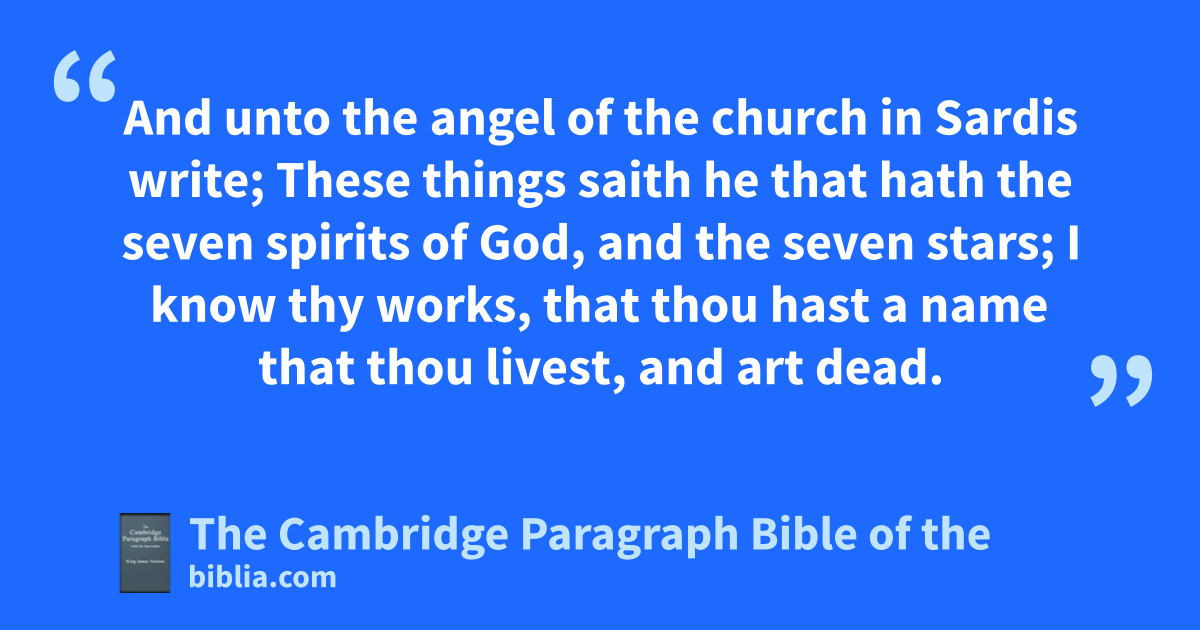 III. And unto athe angel of the church in bSardis write; These things saith he that hath cthe seven spirits of God, and dthe seven stars; I eknow thy works, that thou hast a name fthat thou livest, and fgart dead. 2 Be hwatchful, and strengthen the things which remain, that are ready to die: for I have not found thy iworks perfect before God. 3 kRemember therefore how thou hast received and heard, and hold fast, and lrepent. If therefore thou shalt not hwatch, I will mcome on thee nas a thief, and nthou shalt not know what hour I will come upon thee. 4 Thou hast a few onames even in bSardis, which have not pdefiled their garments; and they shall walk with me qin white: for they are rworthy. 5 sHe that overcometh, the same tshall be clothed qin white raiment; and I will not ublot out his name out of vthe book of life, but wI will confess his name before my Father, and xbefore his angels. 6 yHe that hath an ear, let him hear what the Spirit saith unto the churches.
