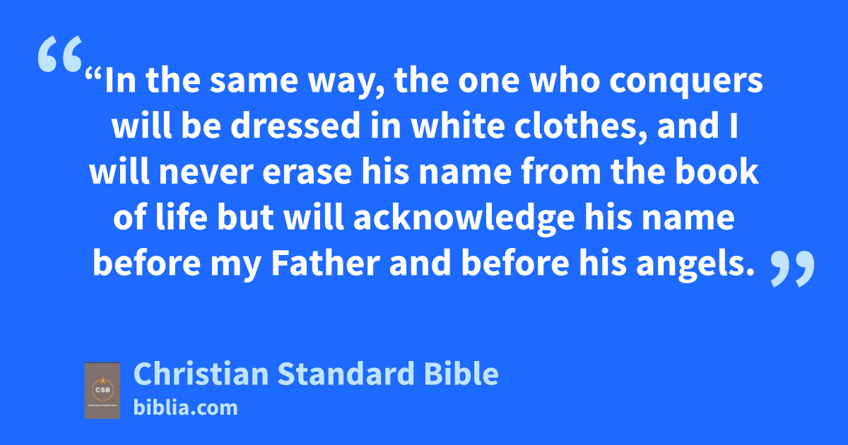5 “In the same way, the one who conquersh will be dressed in white clothes,i and I will never erase his name from the book of lifej but will acknowledge his name before my Father and before his angels.k